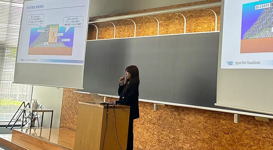 講師を務めた高柳さんは「港湾と聞いても分からないことだらけだと思いますが、講義を通して港湾の建設コンサルタントへ少しでも理解が深まり、設計業務に興味を持ってもらえていたら嬉しいです。」とコメントしていました。